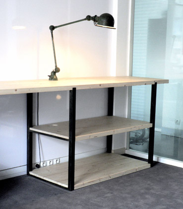 Pour une agence de publicité parisienne. Réalisation d’un ensemble en acier patiné noire et sapin.