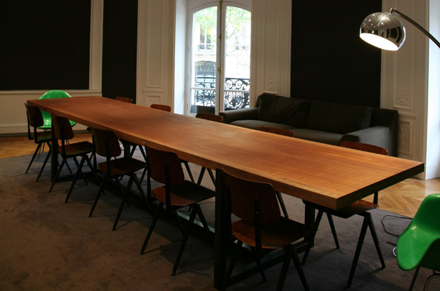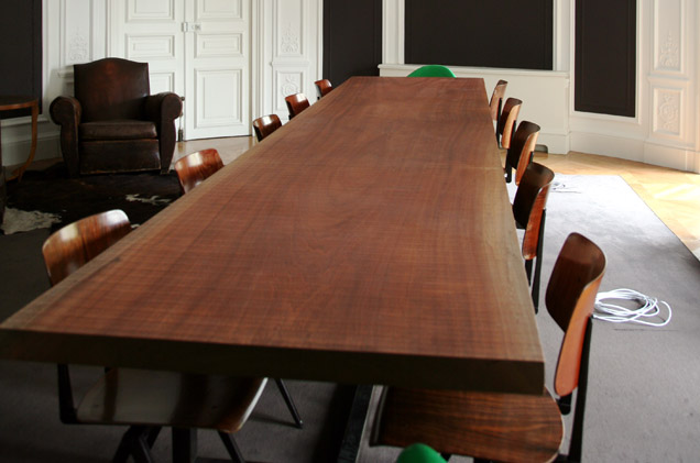 Pour une agence de publicité parisienne. Réalisation d’une table de réunion dans un seul morceau de bois. Pièlement en acier patiné noir, plateau en sipo de 4m30.