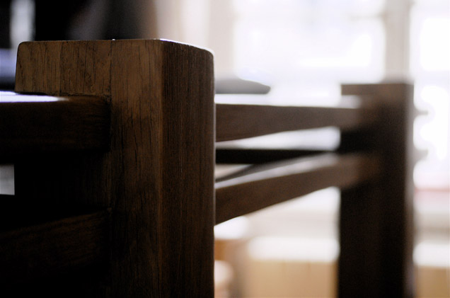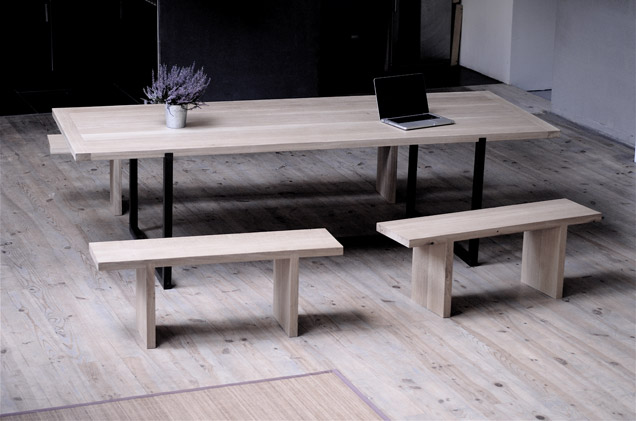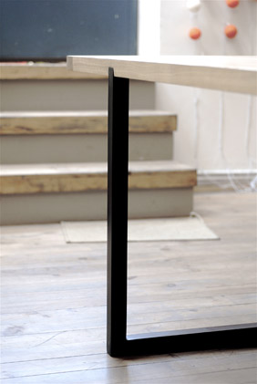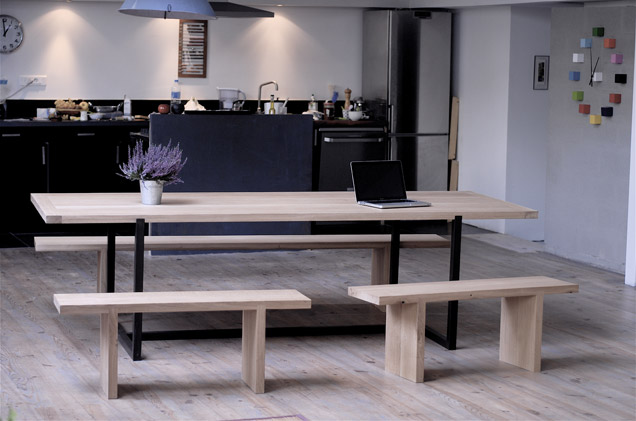 Pour un couple d’artistes de Montreuil. Piètement en acier patiné noir, plateau en chêne massif rainuré pour encastrement.